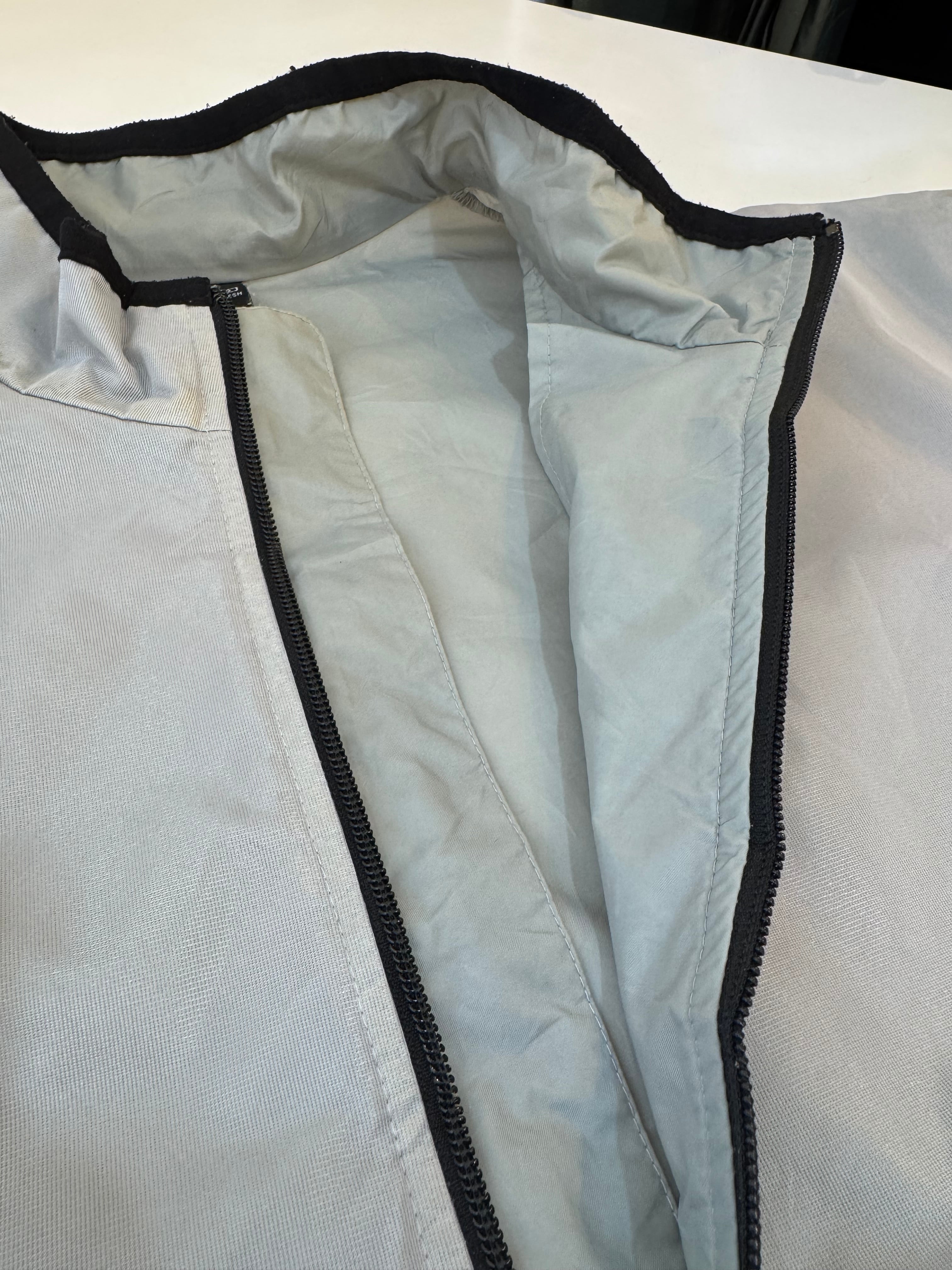 マットな質感のシルバーグレーに、ブラックのジップ&パイピングが映えるミニマルなデザイン。無駄を削ぎ落としたテック感のあるルックスは、近年のストリート〜モードスタイルとも相性抜群です。
